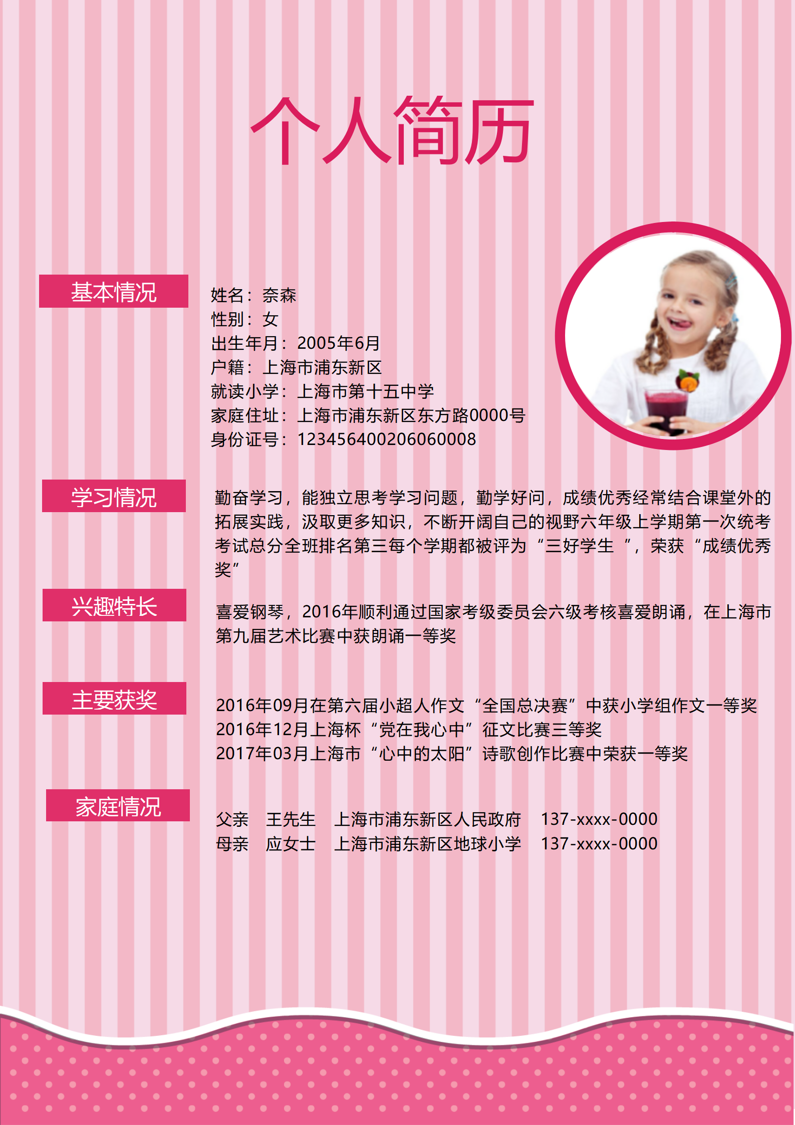 小升初学生个人免费简历模板。从学生视角设计,鼓励孩子认识自我,并参与到自己简历的制作中。无论是应届生还是有工作经验求职者都很适合(程序员下班了真无聊,网上随便抓的,无套路),助力大家做好简历,Offer拿到手软。