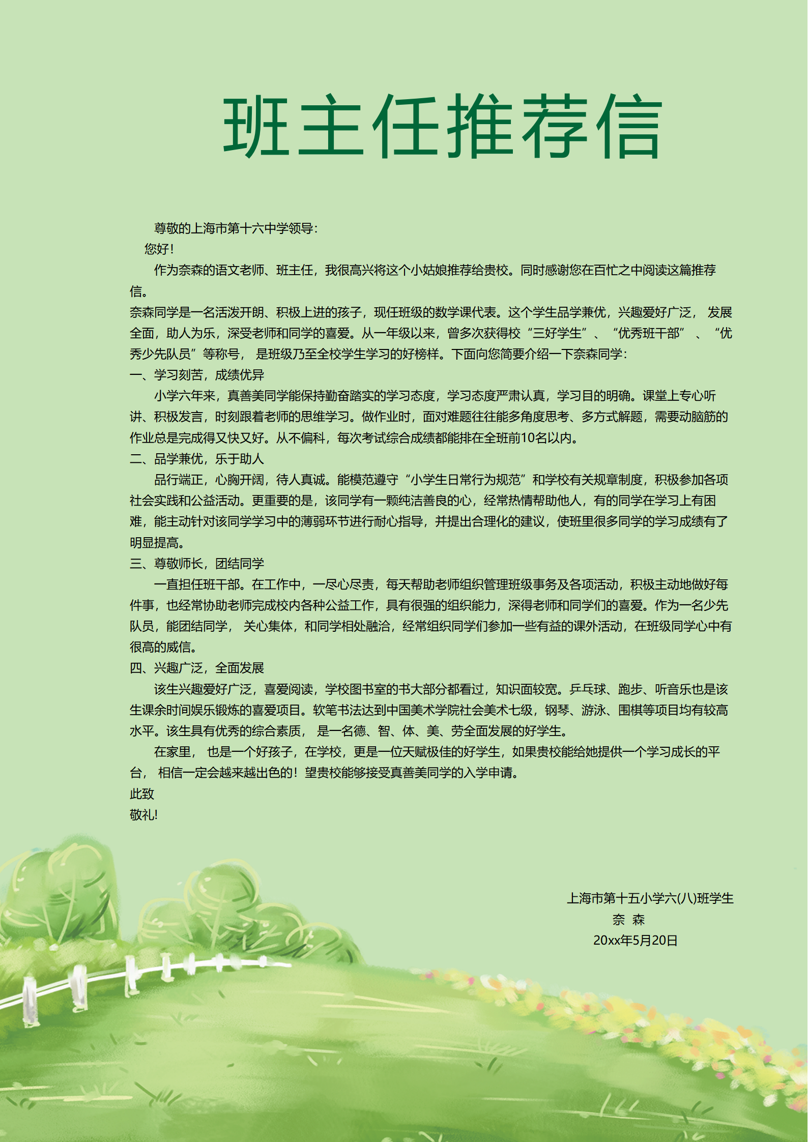 当前位置:51简历模板 - 小升初绿色个人简历模板电子版免费