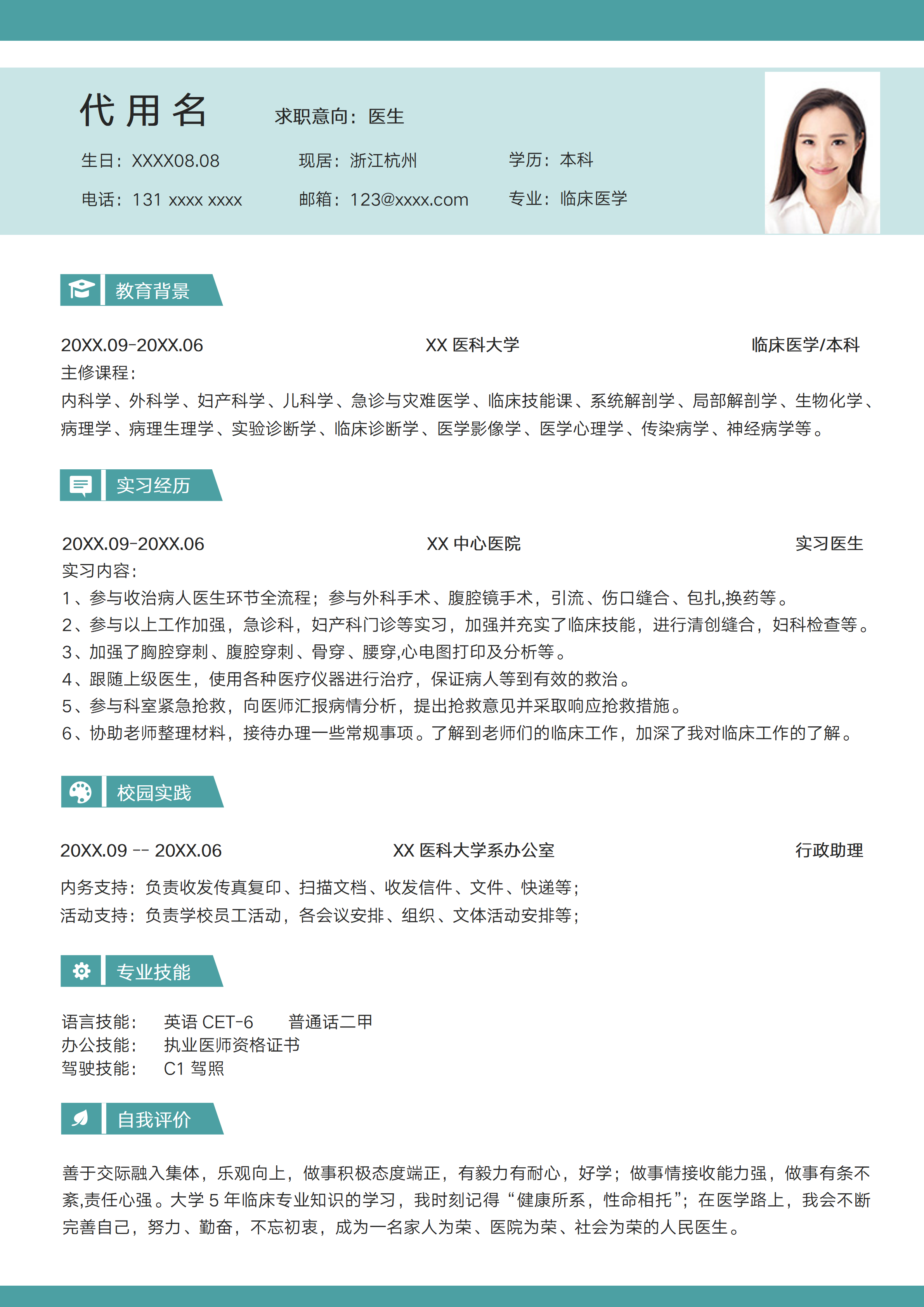 简约蓝色应届生医生求职简历