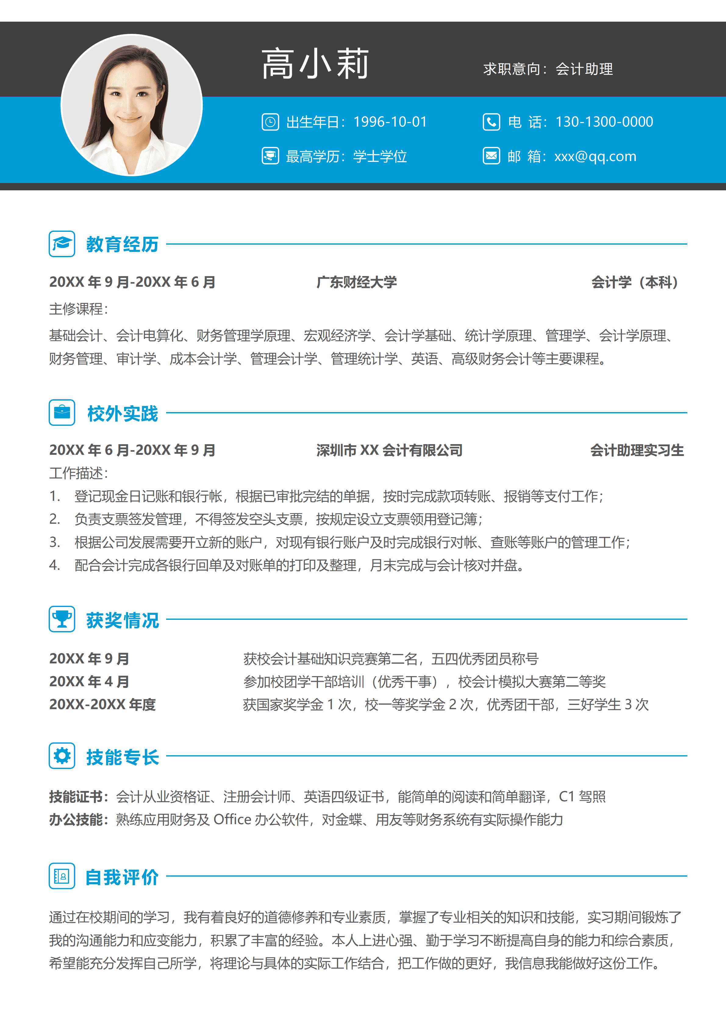 简约应届生会计助理无经验单页简历