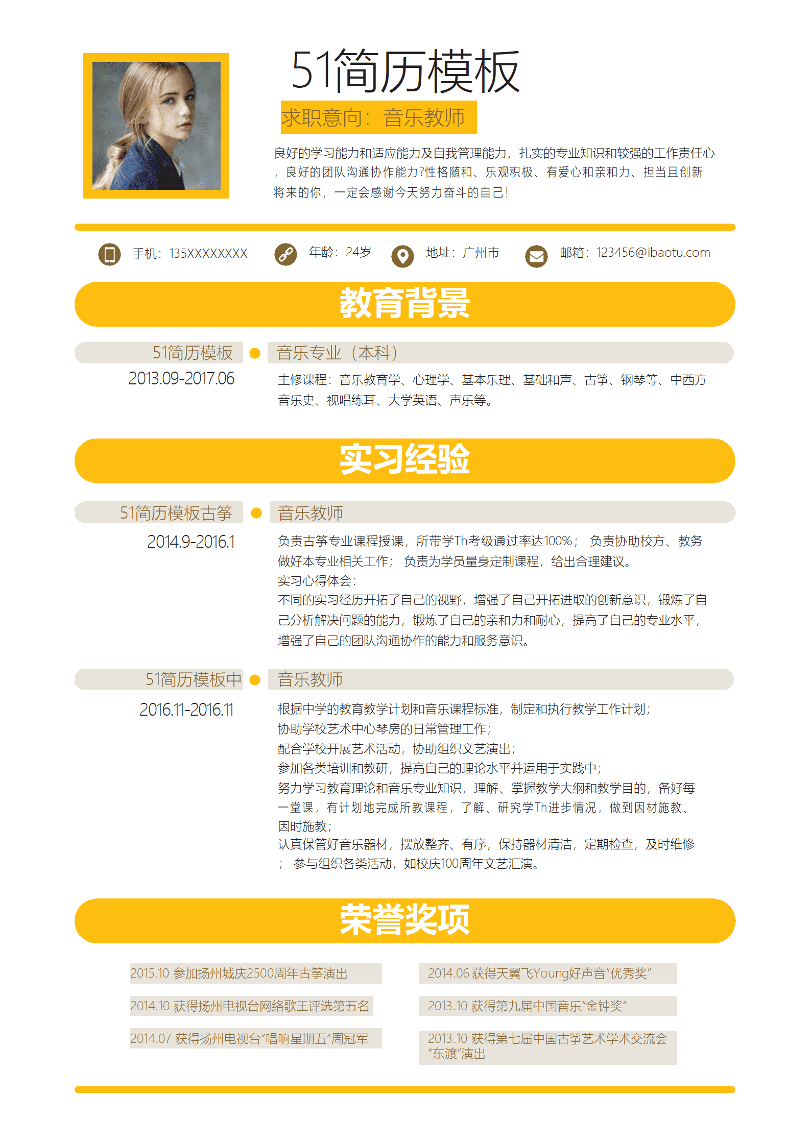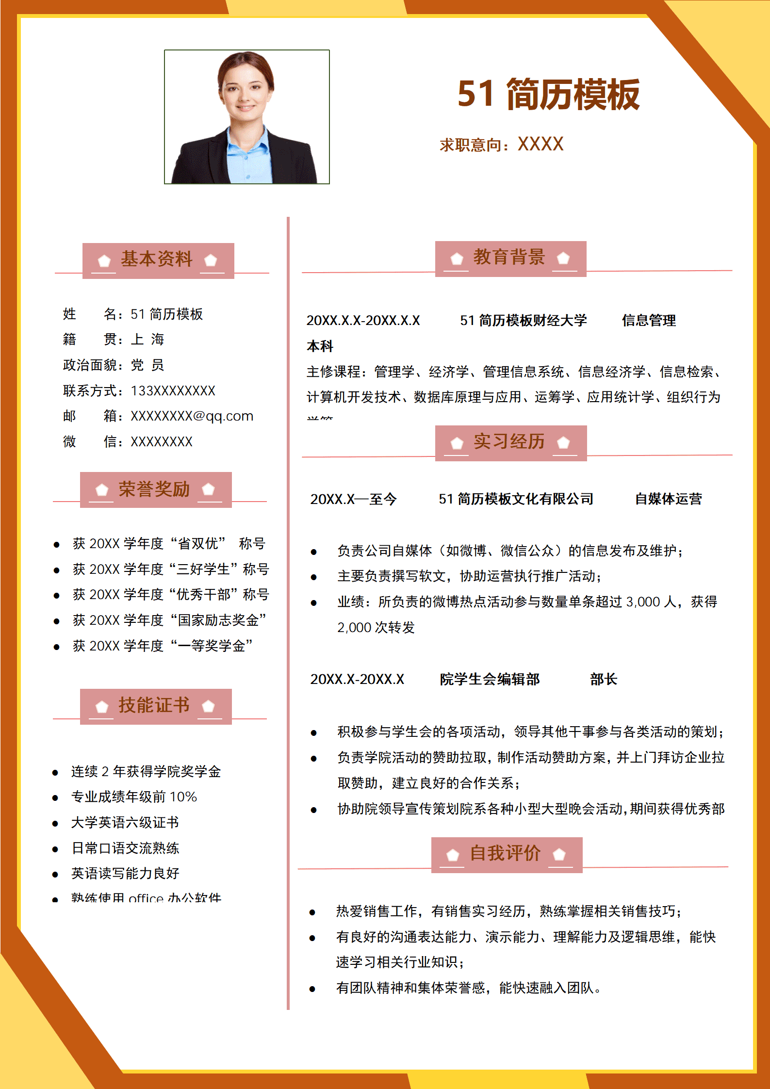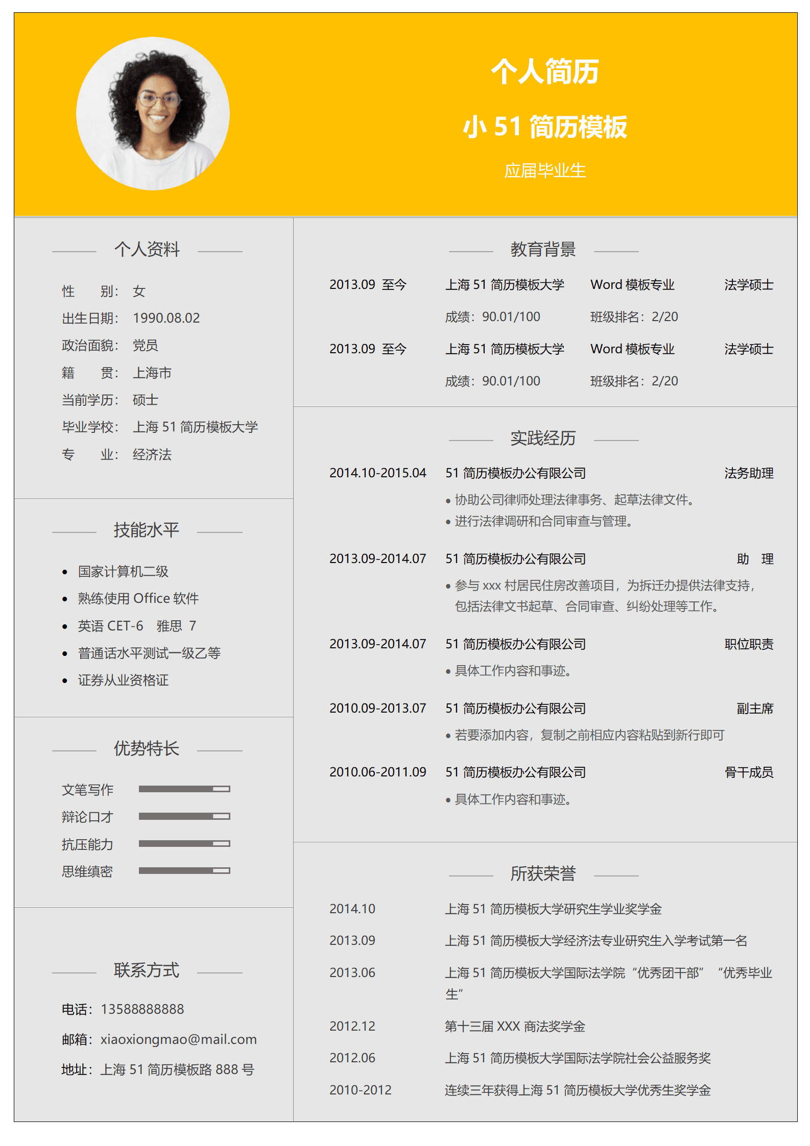 简洁黄白色应届毕业生简历实习生简历个人简历模板