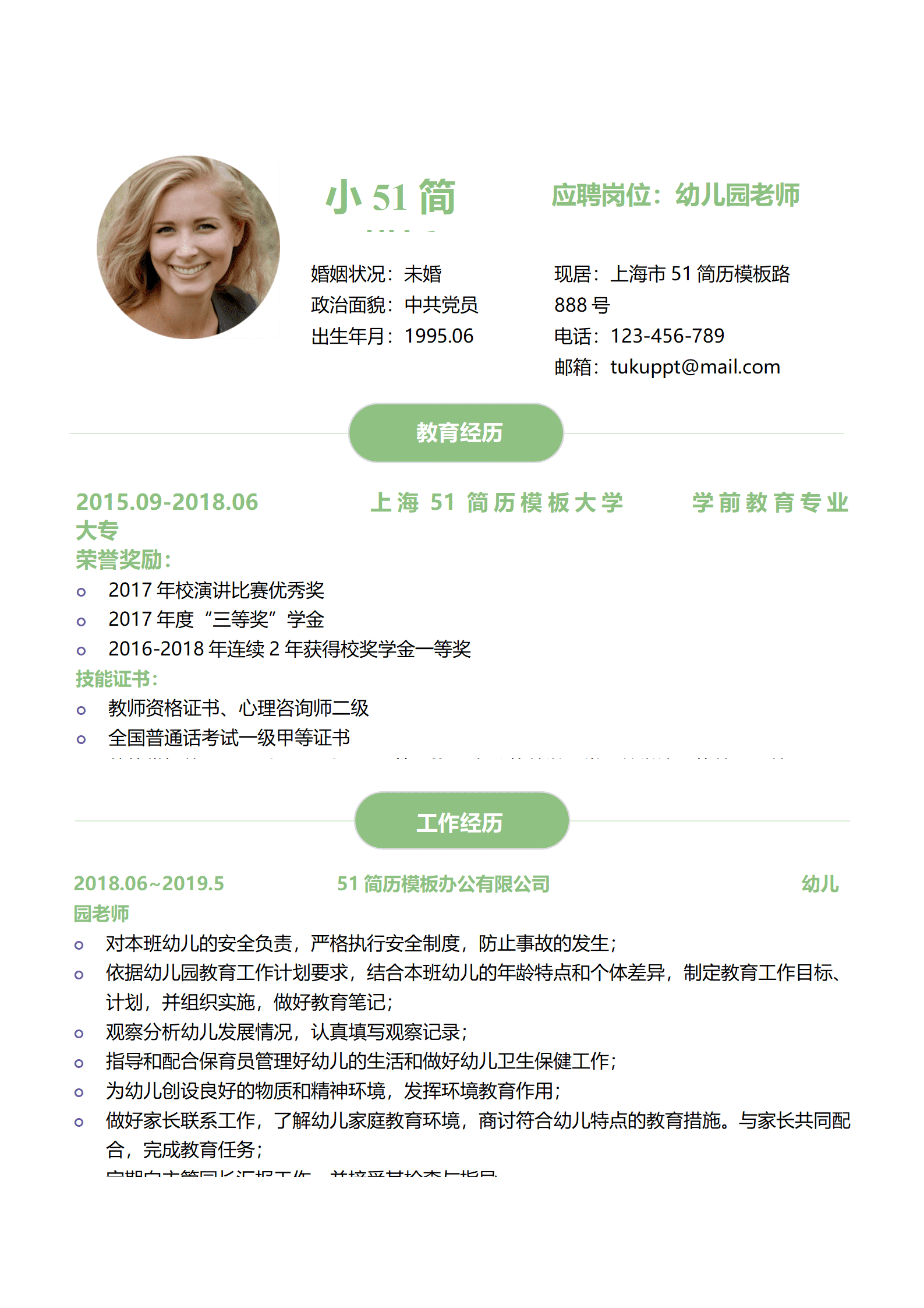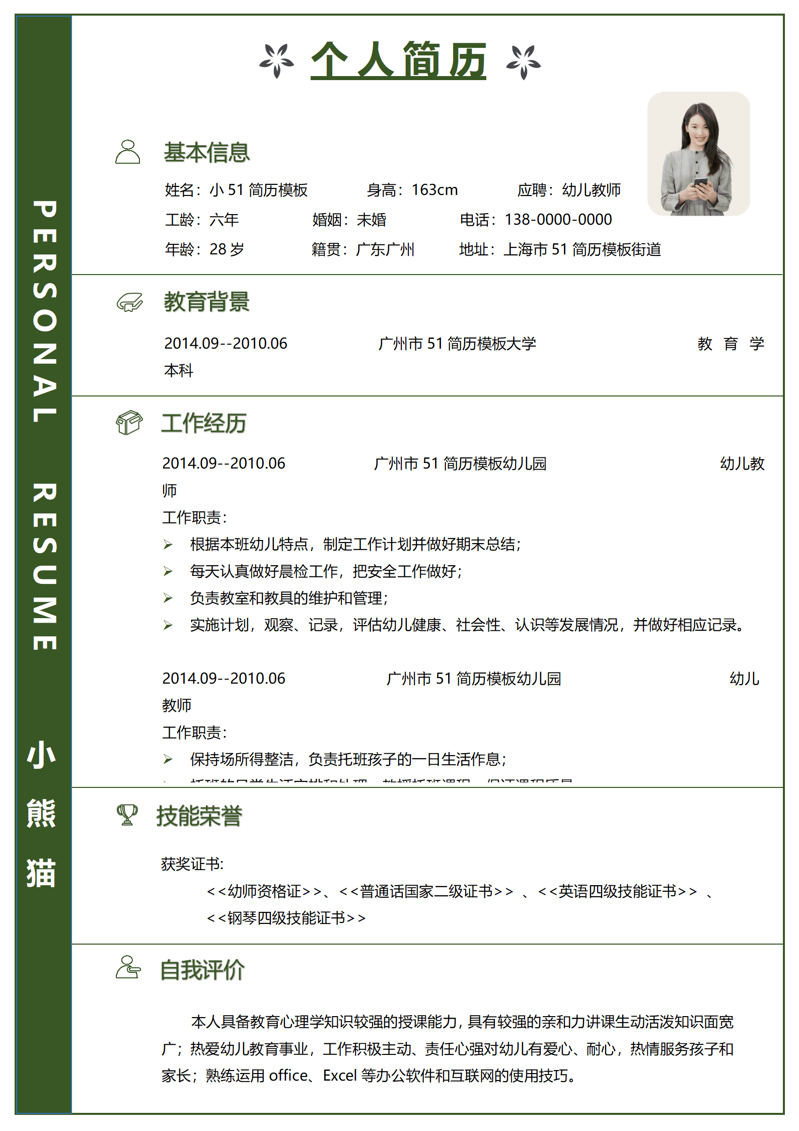 免费幼儿教师简历