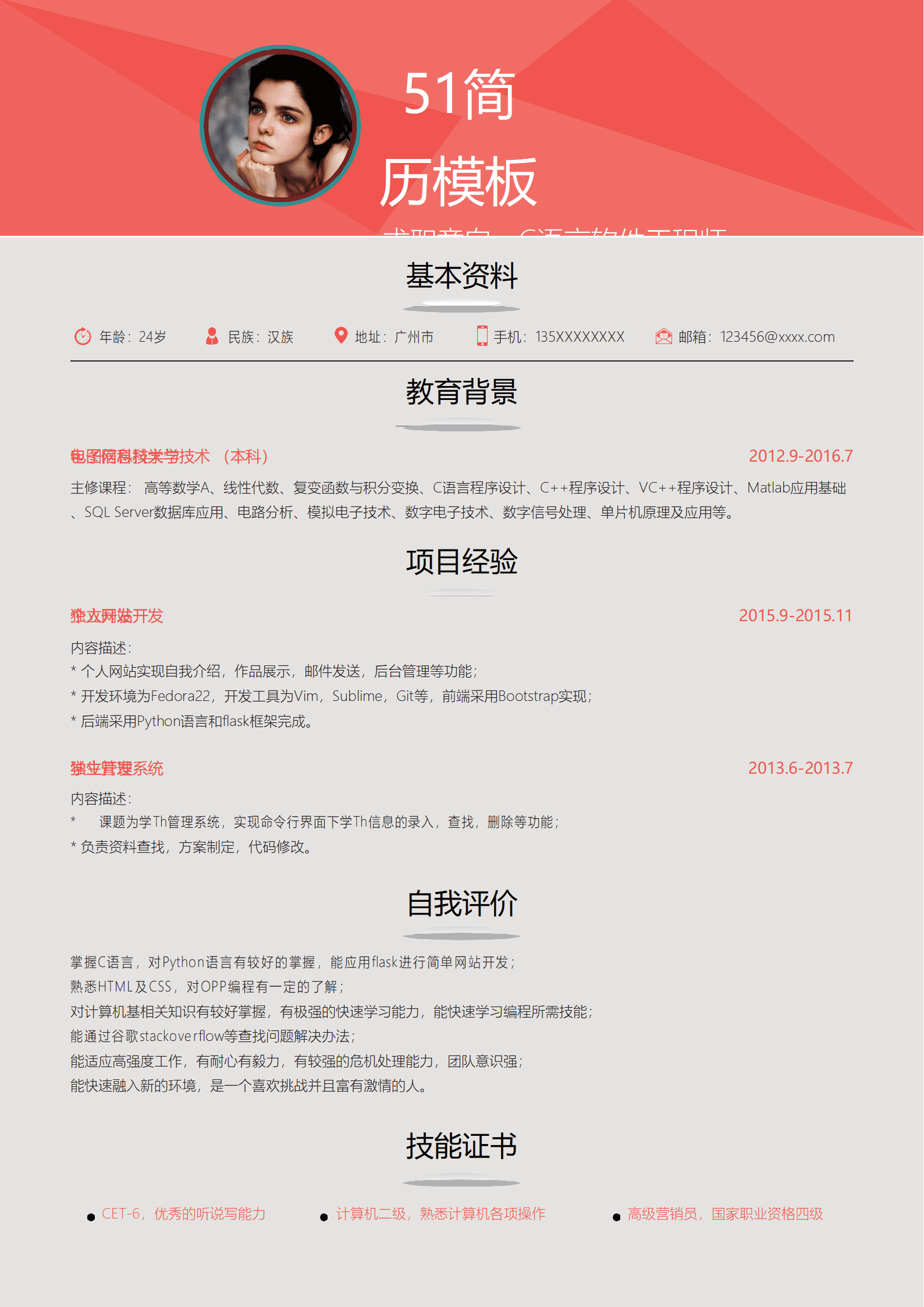语言软件工程师简历通用word简历模板