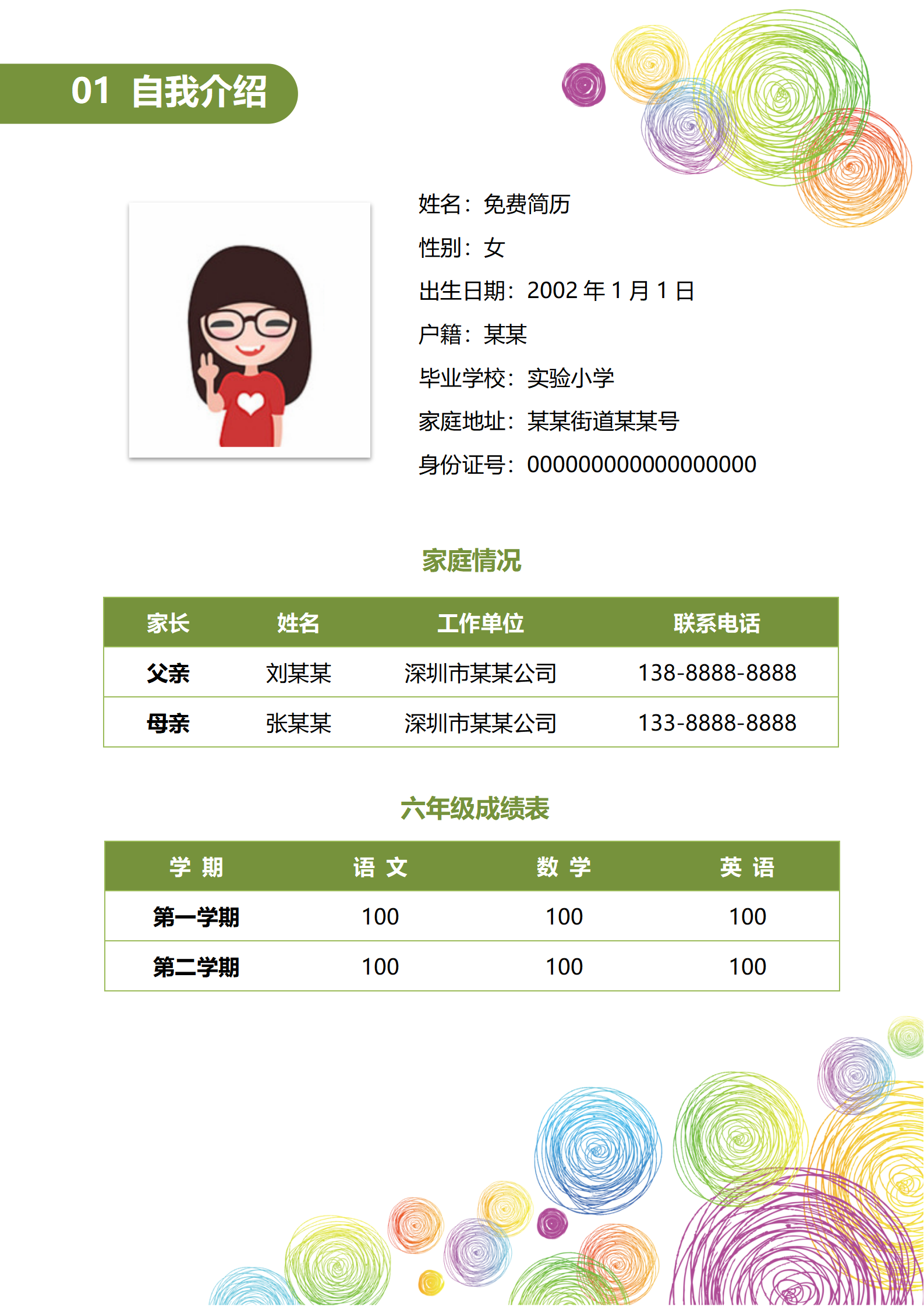 彩色活泼风格的小学生小升初免费简历。设计充满童趣,能充分展现孩子的朝气与活力。无论是应届生还是有工作经验求职者都很适合(程序员下班了真无聊,网上随便抓的,无套路),助力大家做好简历,Offer拿到手软。
