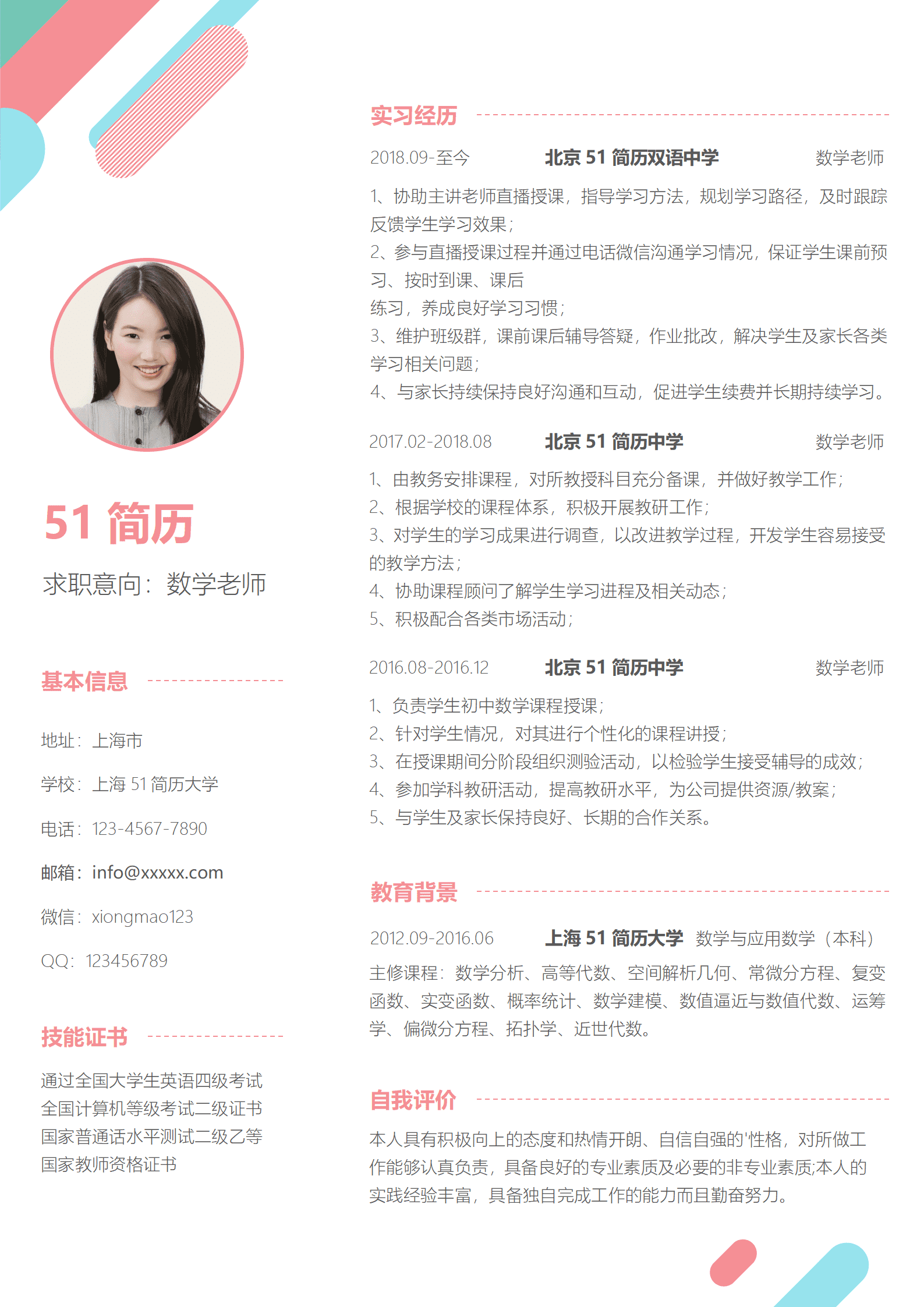数学老师1-3年免费简历模板