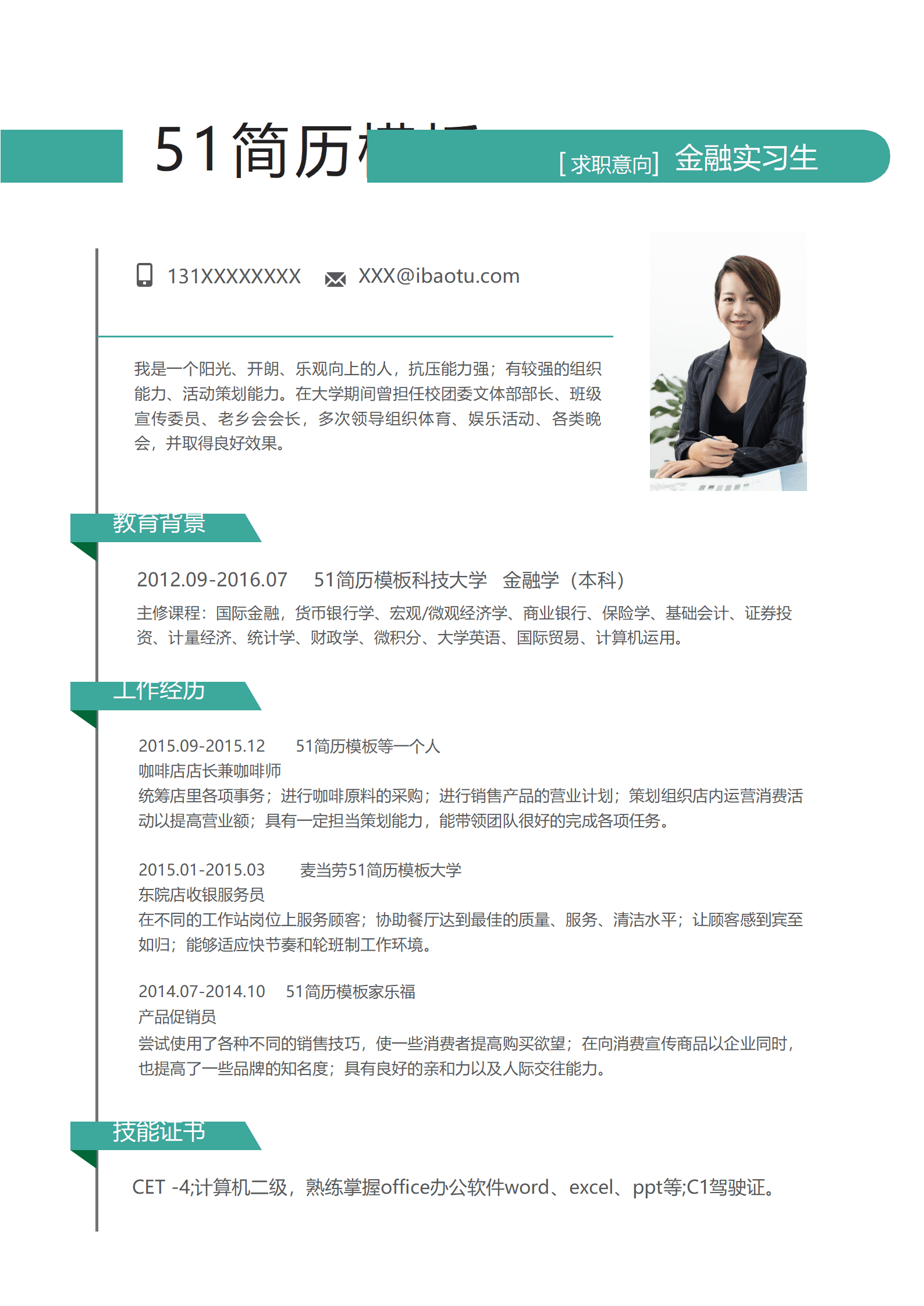 免费简约风金融实习简历word模板 (2)