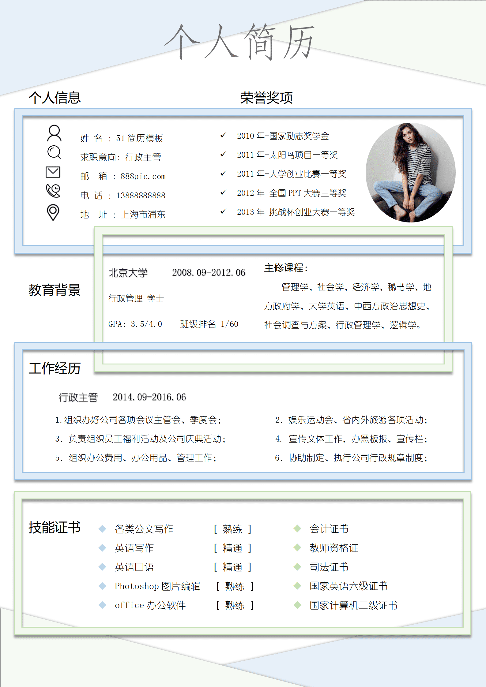 行政文职办公助理类岗位求职简历模板