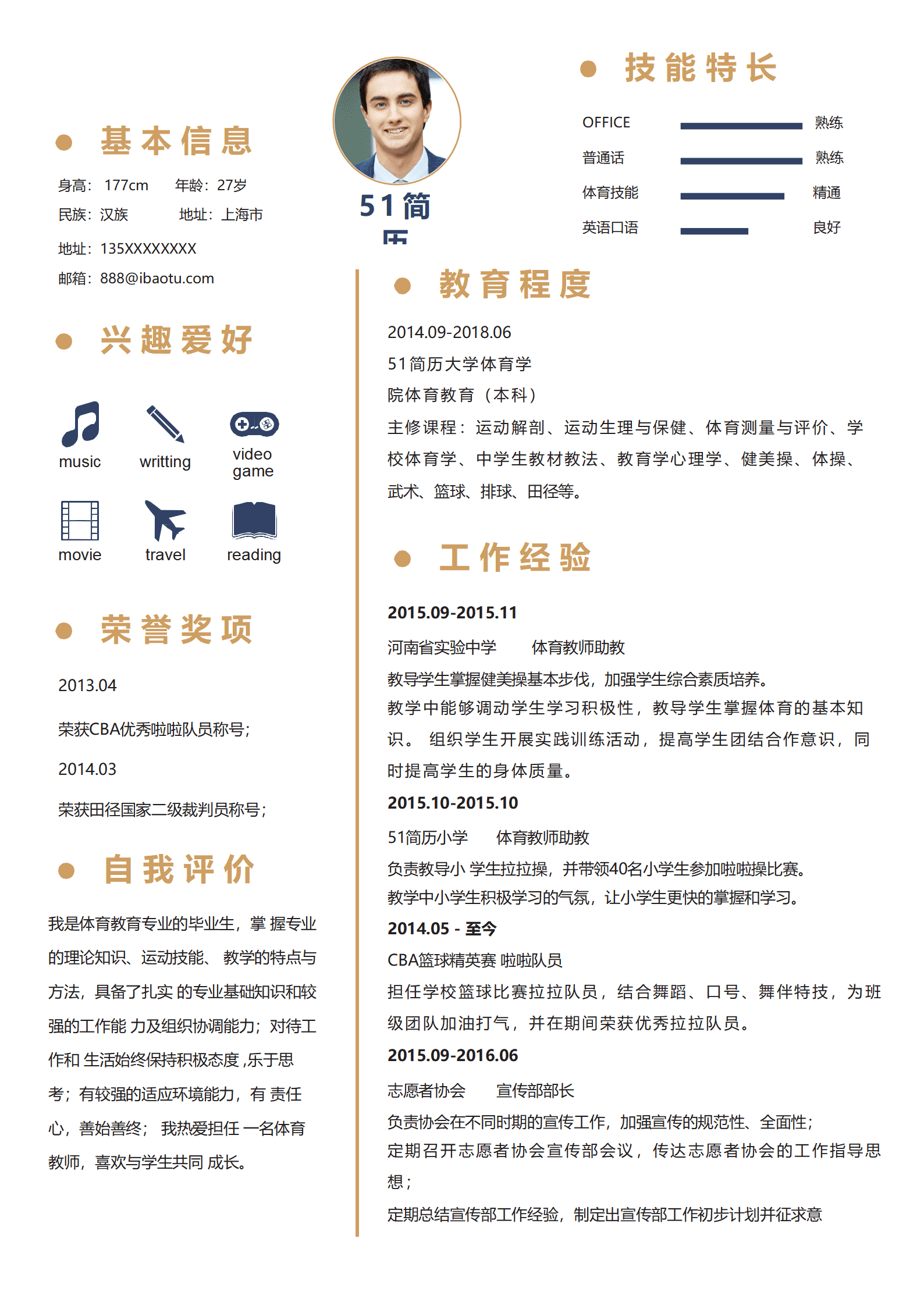 免费蓝色简约文员个人求职简历Word模板 (1)