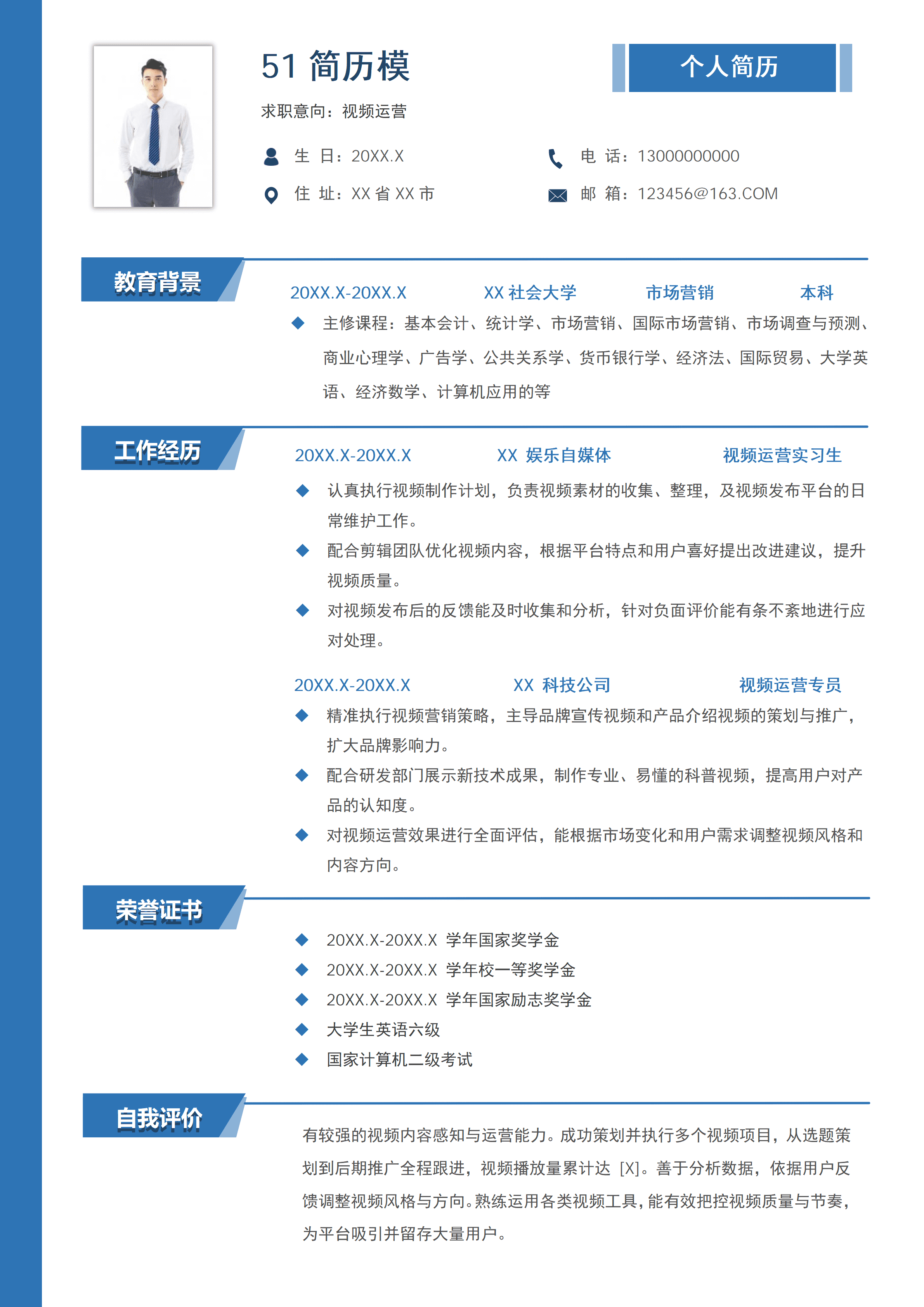 视频运营师蓝色简约简历word模板