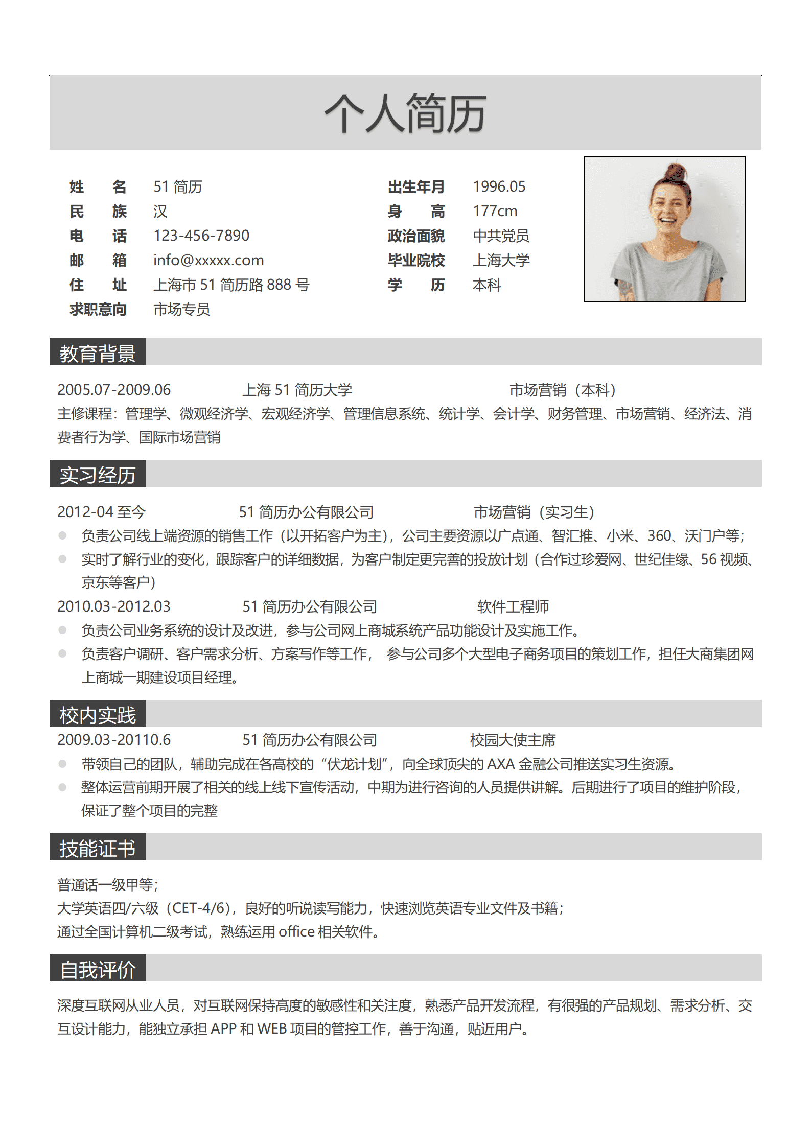 极简风格灰色市场专员求职简历word简历模板