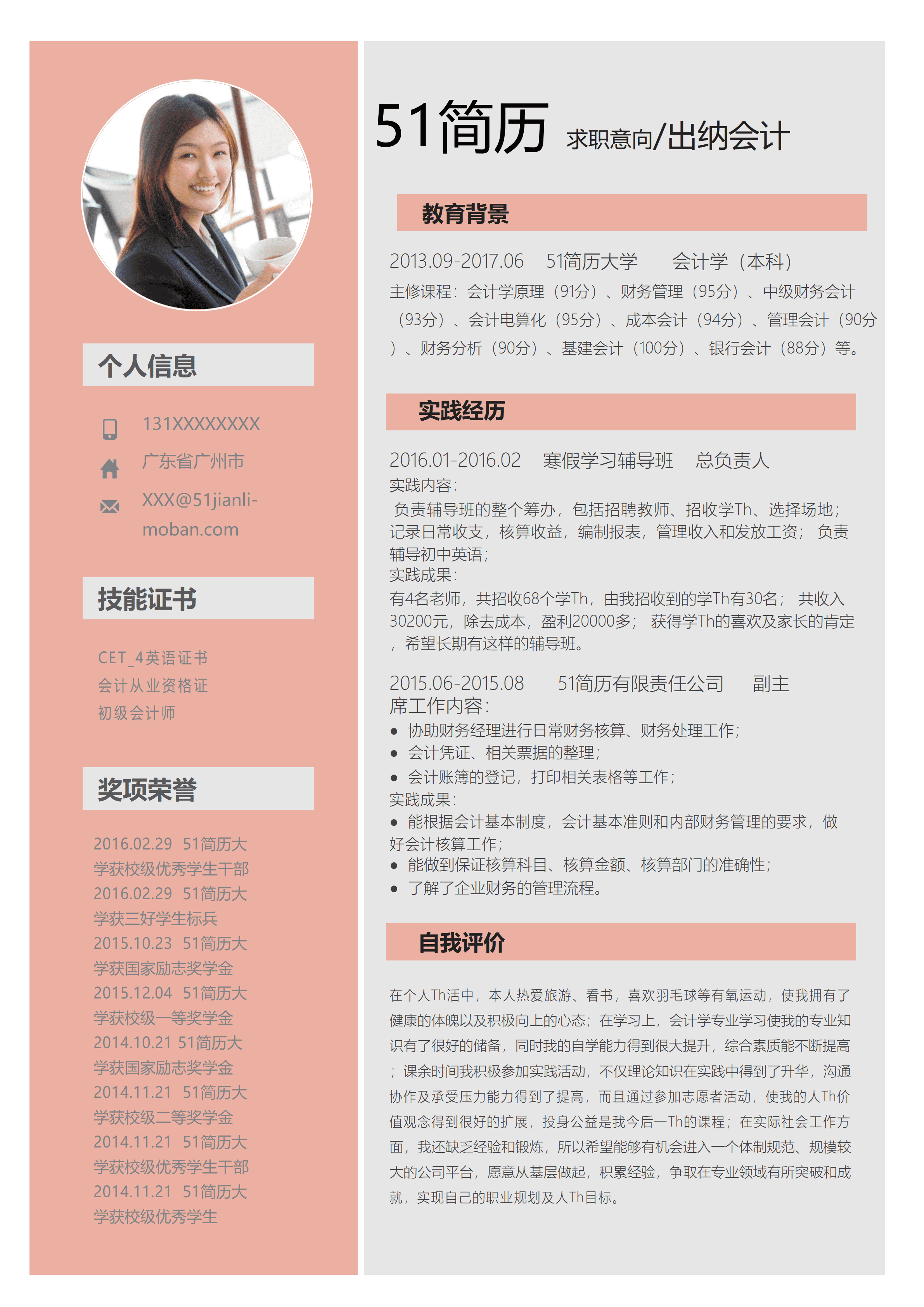 出纳会计粉色通用简历word模板