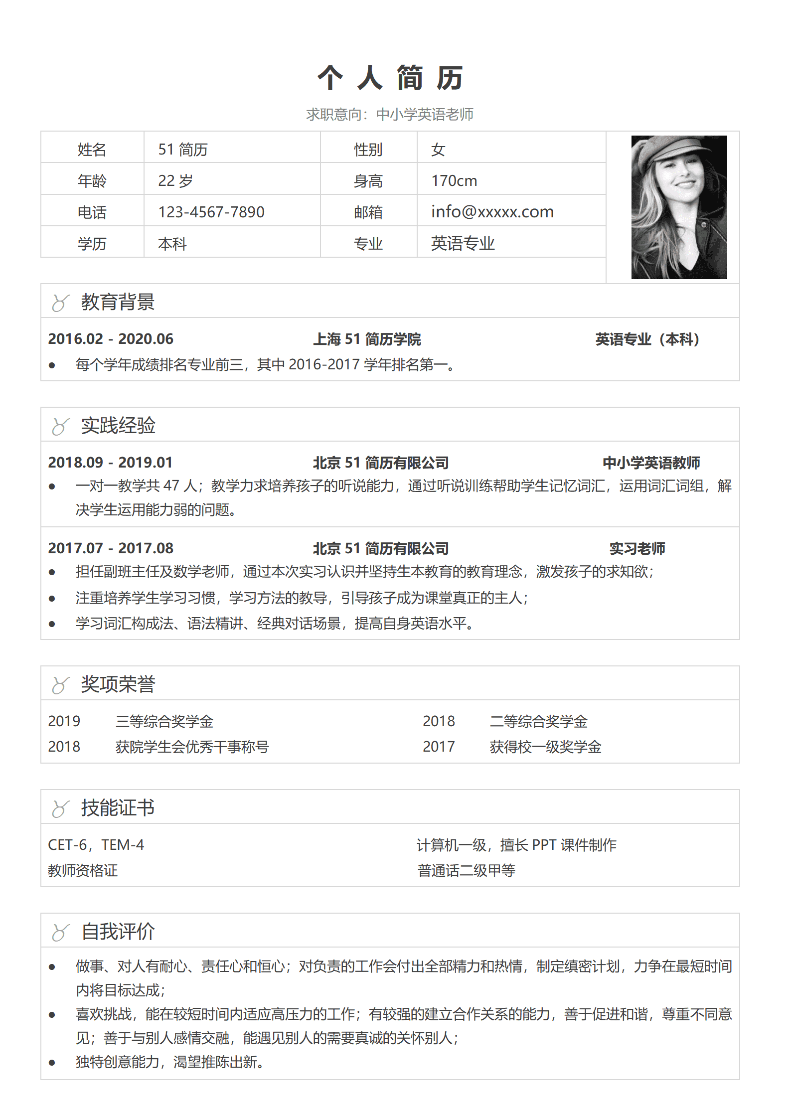 中小学英语老师免费简历模板1-3年