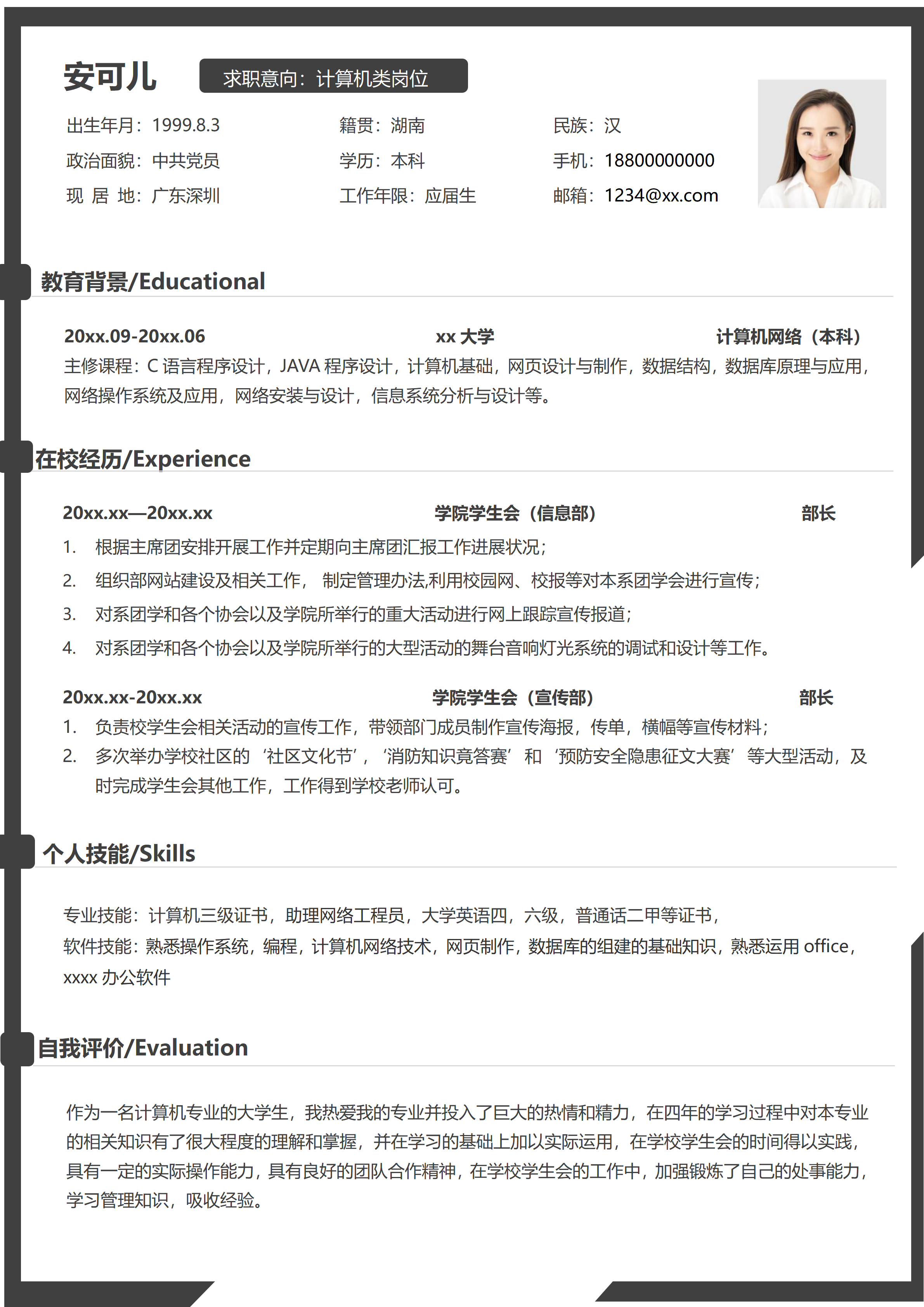 计算机应用与技术相关专业应届生求职简历模板
