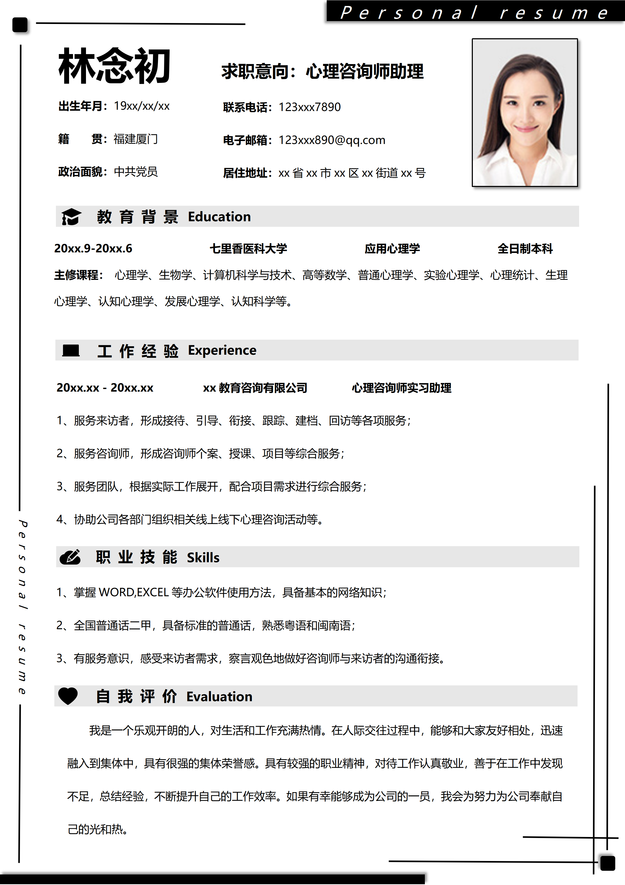 应届生心理咨询师助理简历