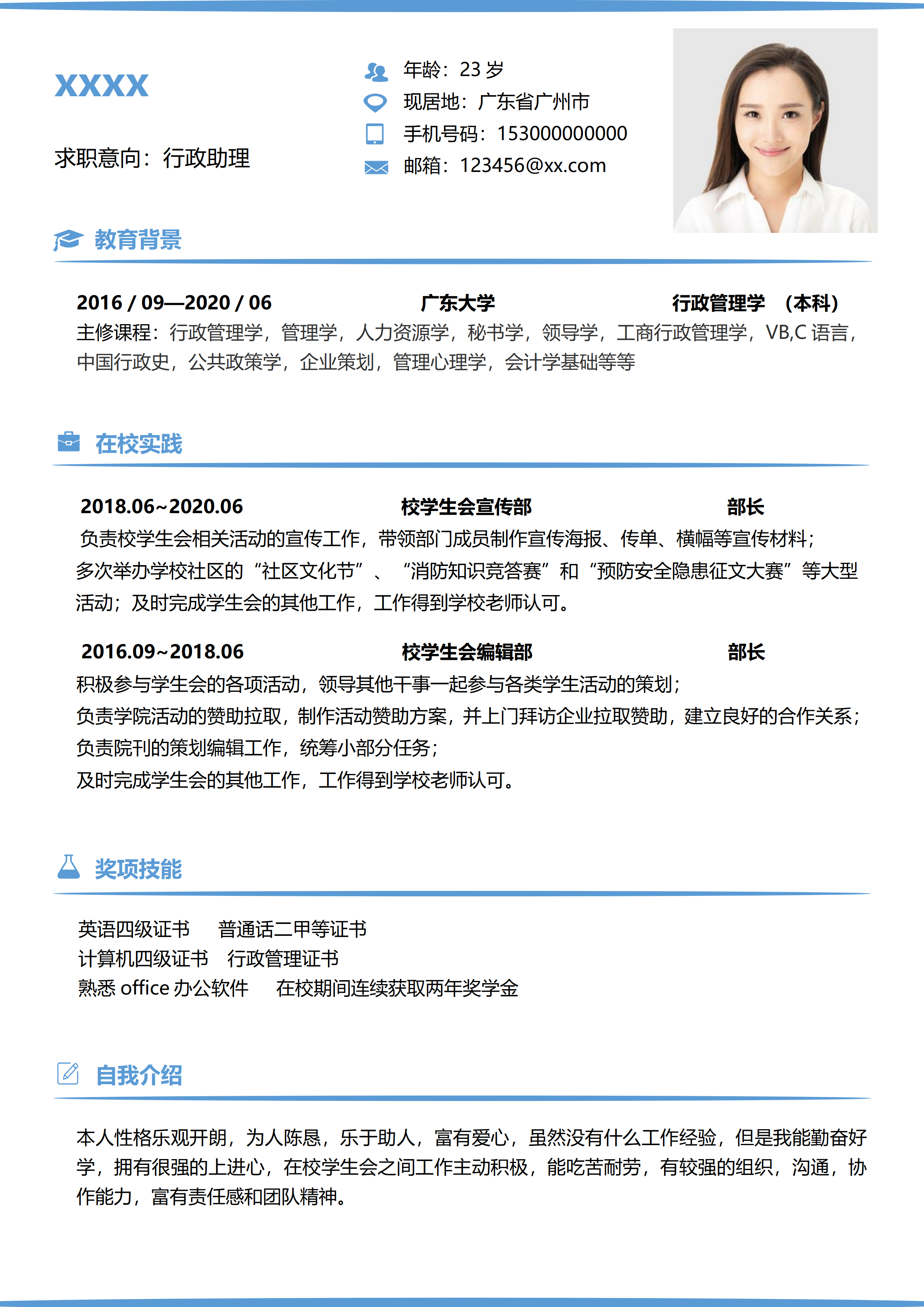 应届生简约行政个人求职简历